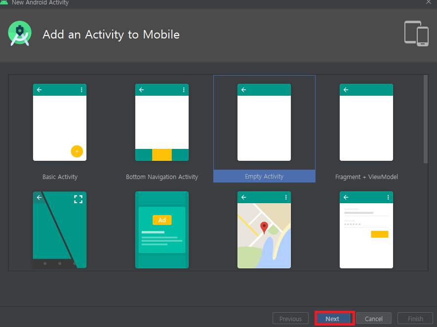 SubMenu New -> Activity -> Empty Activity 를 선택.