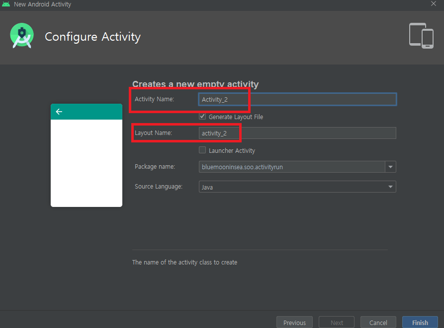Activity 와 Layout name 을 설정하고, Finish 버튼을 선택하면 화면 추가 작업이 마무리 된다.